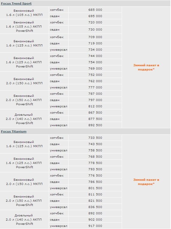 * При покупке автомобиля Ford Focus 2012 года производства (кроме Ford Focus в комплектации Ambiente/Амбиенте и автомобиля Ford Focus ST) в период с 01.01.2013 по 31.03.2013, максимальная экономия клиента по данному предложению составит 50 000 рублей с НДС от розничной цены, установленной дилером, которая включает: 1) экономию на автомобиль 20 000 руб. с НДС; 2) «Пакет «Зимний» - электроподогрев передних сидений, электрообогрев лобового стекла и форсунок стеклоомывателей» в подарок либо экономию 11 900 руб. с НДС; 3) а также комплект зимних шин в подарок от дилера либо дополнительную экономию в размере 18 100 руб. с НДС. При покупке автомобиля Ford Focus 2013 года производства (кроме Ford Focus в комплектации Ambiente/Амбиенте и автомобиля Ford Focus ST) в период с 01.01.2013 по 31.03.2013, максимальная экономия клиента по данному предложению составит 30 000 рублей с НДС от розничной цены, установленной дилером, которая включает: 1) «Пакет «Зимний» - электроподогрев передних сидений, электрообогрев лобового стекла и форсунок стеклоомывателей» в подарок либо экономию 11 900 руб. с НДС; 2) а также комплект зимних шин в подарок либо дополнительную экономию в размере 18 100 руб. с НДС.